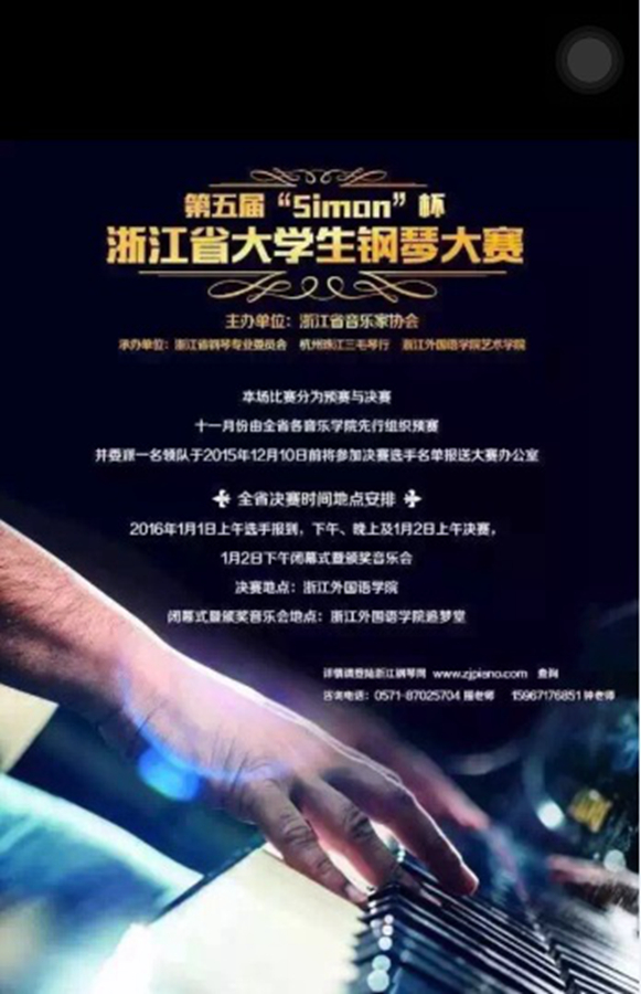为选拔新生代钢琴艺术人才,充分展示当代大学生的时代风貌,为全省钢琴专业在校大学生学提供一个展示才华、相互交流学习的机会,由浙江省音乐家协会主办,浙江省钢琴专业委员会、杭州珠江三毛琴行有限公司和浙江外国语学院艺术学院承办的第五届“SIMON”杯浙江省大学生钢琴大赛于1月1日在浙江外国语学院举行。