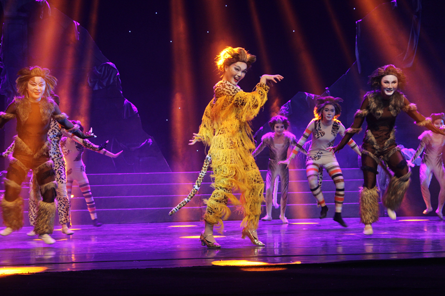 整场演出,我们节选了原版13个比较精彩的片段进行演绎,当中不乏《杰里科猫之歌》《格力莎贝拉·魅力猫》《格斯·剧院猫》等精彩唱段。为了能够更好表现剧中内容,我们还用了大量的舞蹈场面来表现猫的不同性格特征,既有轻松活泼的踢踏舞,又有充满动感的爵士舞和现代舞。舞美设计理念秉持“从猫眼里看到的世界”原则,在剧场布景中,堆放了大量符合剧情的道具,如旧的轮胎、损坏的电话亭、肮脏的垃圾桶、到处乱扔的可乐罐、天桥等。猫的服装也全按不同猫儿的形象特征来设计,在排练的空余时间,学生们还亲手缝制演出服,演出时,每个演员都被画成了与其身份相符的猫脸,活灵活现地装扮出了一只只性格各异的猫儿。