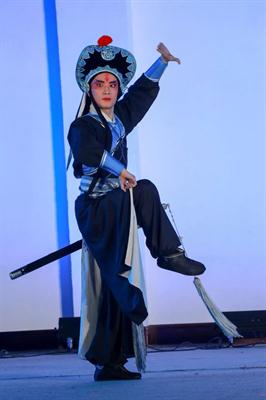 最后一曲折子戏《扈家庄》,由高思盈主演,她今年17岁,饰演的是扈三娘。初学绍剧,是因为妈妈的引导,后来她自己也渐渐喜欢上了戏曲。作为武旦,唱念作打具重,演出中间,高思盈同学因地板潮湿,身上又戴着繁重的衣饰,不慎摔跤,在老师鼓励后,仍旧坚持上台演完了整曲,动听的唱段、高难度的做功配合赢得观众热烈的掌声。