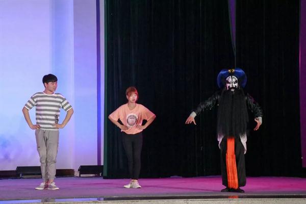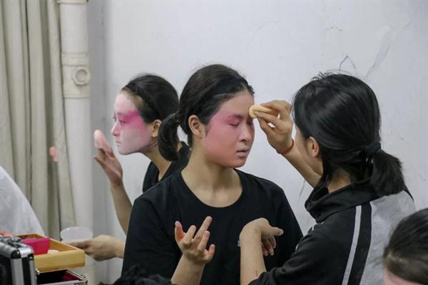 在随后的互动环节里,由李岳成同学指导,4位对戏曲功法跃跃欲试的长征职院学子,学起了基本功,在学习戏曲的路上,一招一式皆是从基本功开始,日复一日的练习里,多的是坚持。正如京昆曲目《林冲夜奔》中饰演林冲的应洲洋,今年19岁,学习戏曲已经是第四个年头,他在接受采访时表示,戏曲界有“男怕夜奔,女怕思凡”的说法,像自己这样并不是非常老练的学生来说,想要表现出角色悲愤、英雄气短的情绪是比较困难的,因此,对于这个角色,每一次演出对自己而言都是非常大的挑战。《夜奔》既讲究唱工又讲究做工,身段极其繁复,并且整出戏都是边舞边唱。几乎每个字都有身段,要求演员一招一式不得含糊,而且需要满宫满调地唱昆腔,这对表演者的表演技术和功力要求很高。