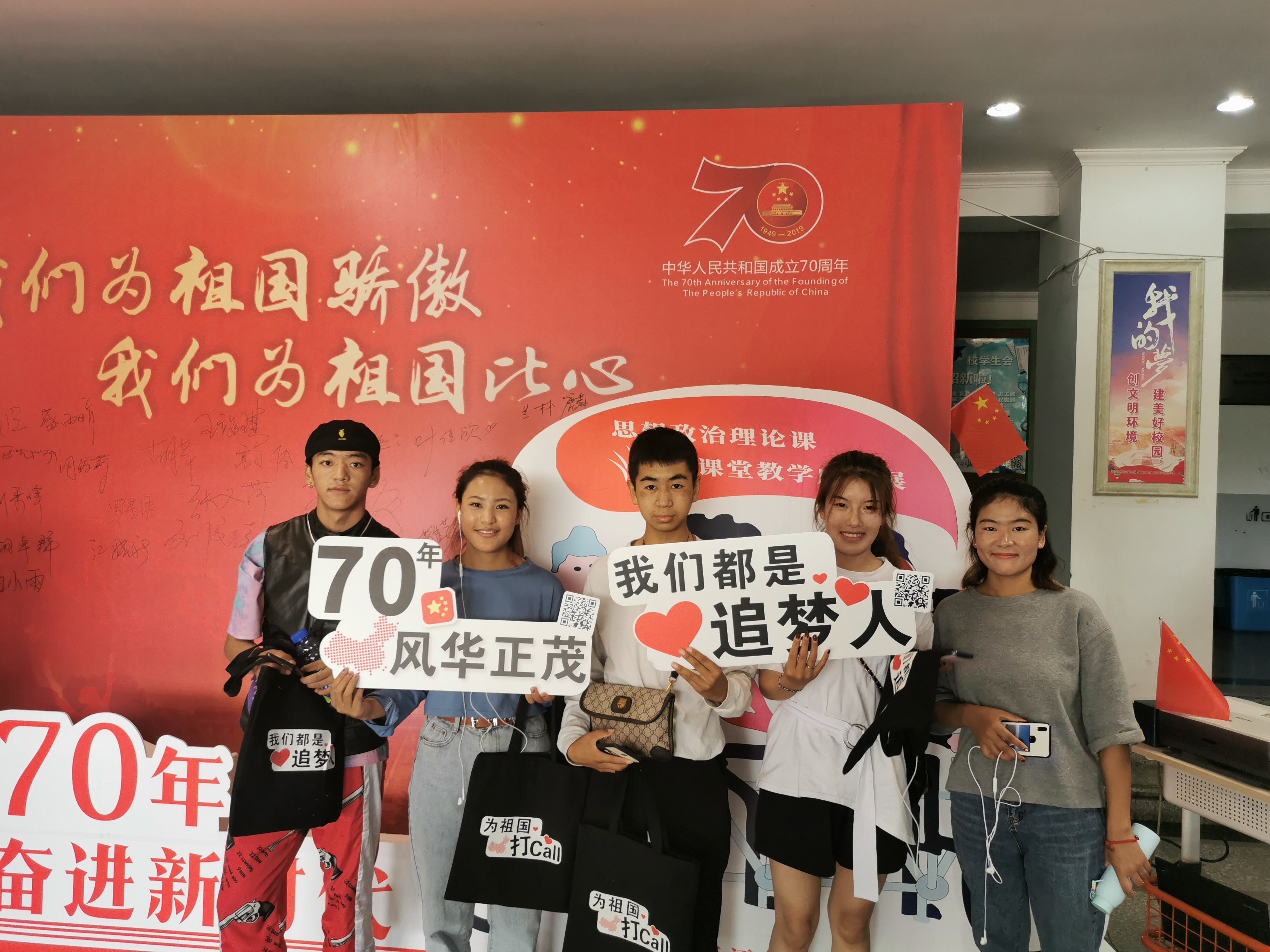 本次成果展是学校向新中国成立七十周年献礼的系列活动之一,创意独特、设计新颖,得到了许多前来参观的师生的赞赏。热场的快闪《我和我的祖国》表达了学生和祖国永远在一起,一刻不分离的深情厚谊。展厅现场人潮涌动,师生认真看展,积极参与互动答题,纷纷在爱国主题墙上承诺签名并拍照留念,表达对我们伟大祖国的深情祝福。