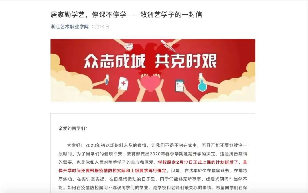 为了让学生们更高效地投入线上教学,教学管理组给学生们写了一封信,详细介绍疫情期间线上教学的方式方法,将学生们关心的诸如开学时间、线上教学、考试、重修、毕业实习等归纳为20个问题,进行详细解答。