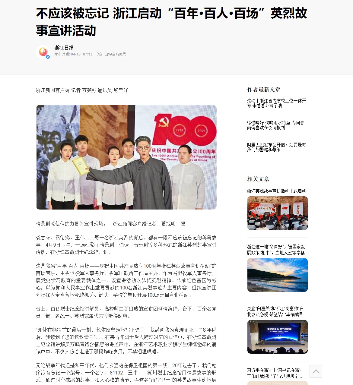 浙江日报:不应该被忘记 浙江启动“百年·百人·百场”英烈故事宣讲活动