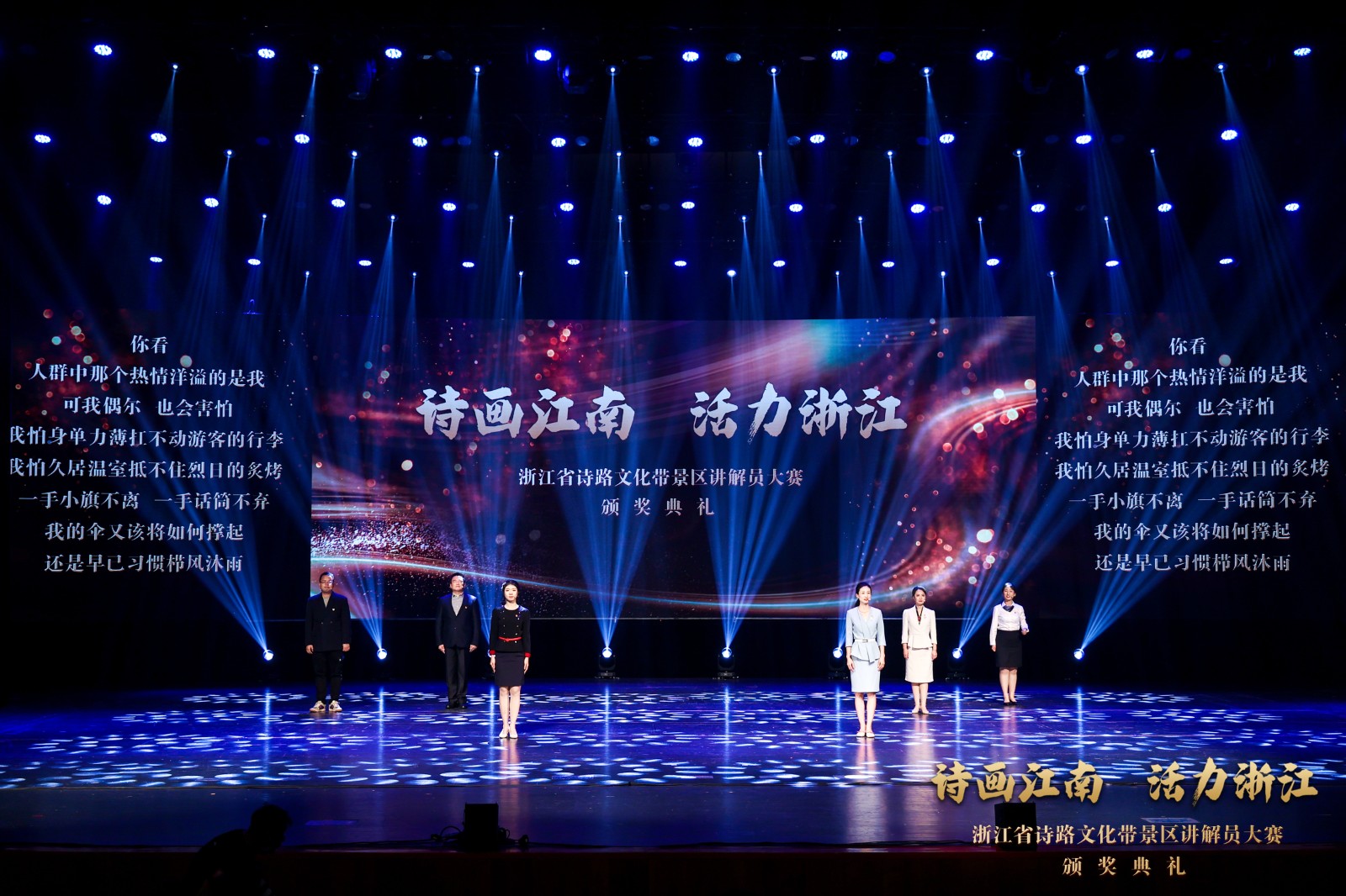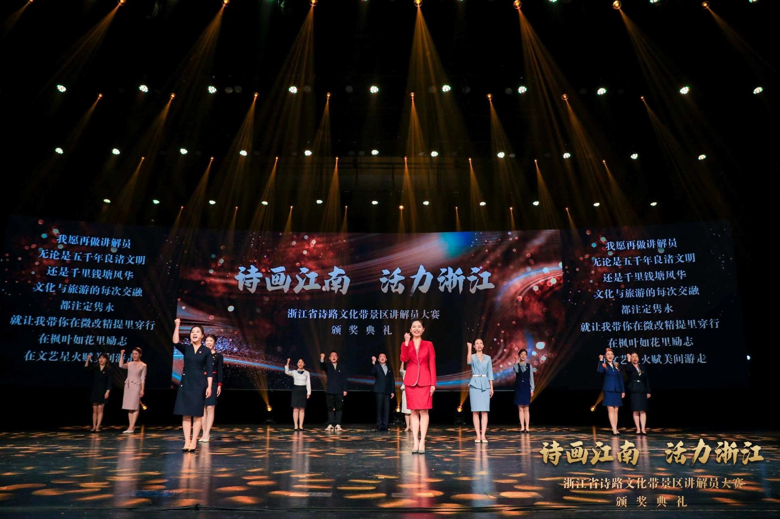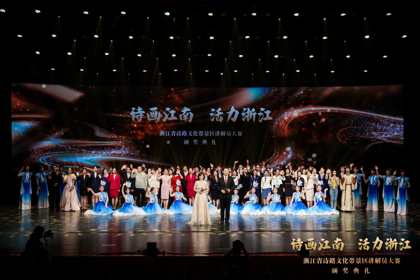 颁奖典礼巧思满满、创意十足,通过北宋大文豪苏东坡穿越时空,与扮演“柯岩景区讲解员”的上官寻声展开对话,将颁奖等各环节巧妙串接。宋韵舞蹈《寻声而来》、 情景朗诵《扬帆启航》、金牌讲解员群诵《我愿意再做讲解员》、歌舞《诗画中国》等节目串联其中,将“诗画江南”浓缩于舞台之上,观众们直呼过瘾,掌声、呐喊声不断。其中吴婧与学生的团体表演情景原创小品《神采奕奕》,通过美丽乡村的巨变,看见共富浙江的前景。齐帅和学生表演的曲艺说唱《爱在浙江》,通过新人婚纱照拍摄的故事,由讲解员带着新人走进浙江的四条诗路带景区,让大家近距离感受到诗画江南、活力浙江。