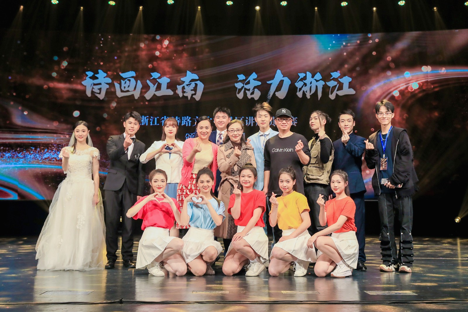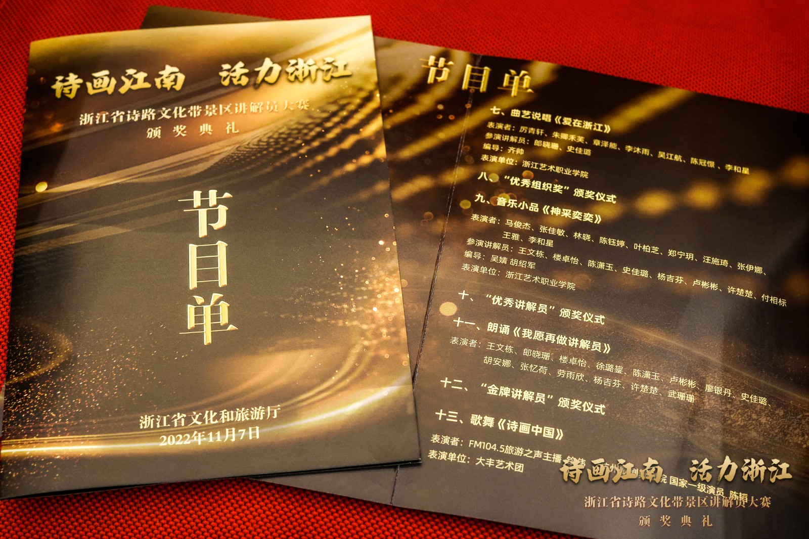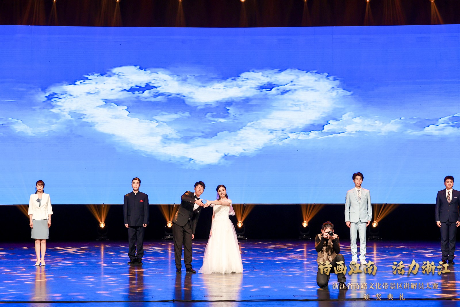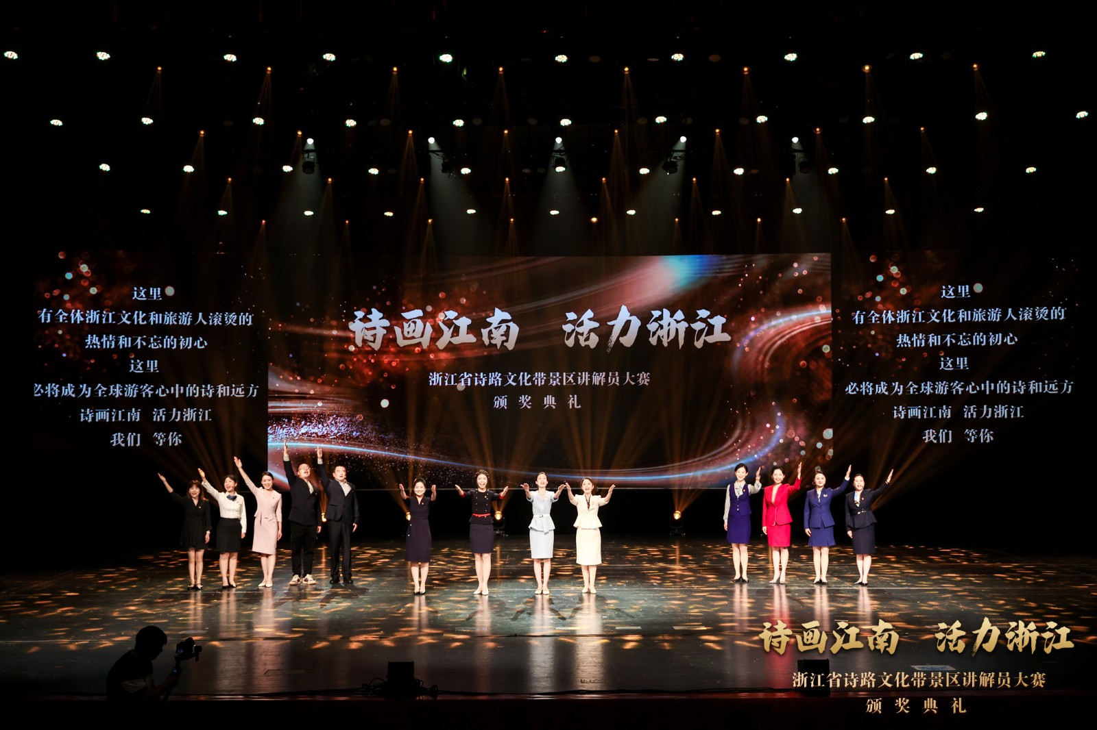 颁奖典礼巧思满满、创意十足,通过北宋大文豪苏东坡穿越时空,与扮演“柯岩景区讲解员”的上官寻声展开对话,将颁奖等各环节巧妙串接。宋韵舞蹈《寻声而来》、 情景朗诵《扬帆启航》、金牌讲解员群诵《我愿意再做讲解员》、歌舞《诗画中国》等节目串联其中,将“诗画江南”浓缩于舞台之上,观众们直呼过瘾,掌声、呐喊声不断。其中吴婧与学生的团体表演情景原创小品《神采奕奕》,通过美丽乡村的巨变,看见共富浙江的前景。齐帅和学生表演的曲艺说唱《爱在浙江》,通过新人婚纱照拍摄的故事,由讲解员带着新人走进浙江的四条诗路带景区,让大家近距离感受到诗画江南、活力浙江。