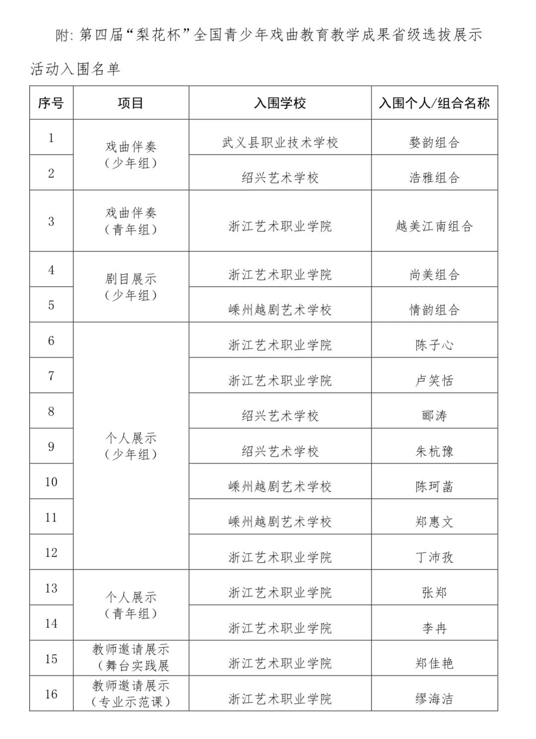 第四届“梨花杯”全国青少年戏曲教育教学成果省级选拔展示活动入围名单