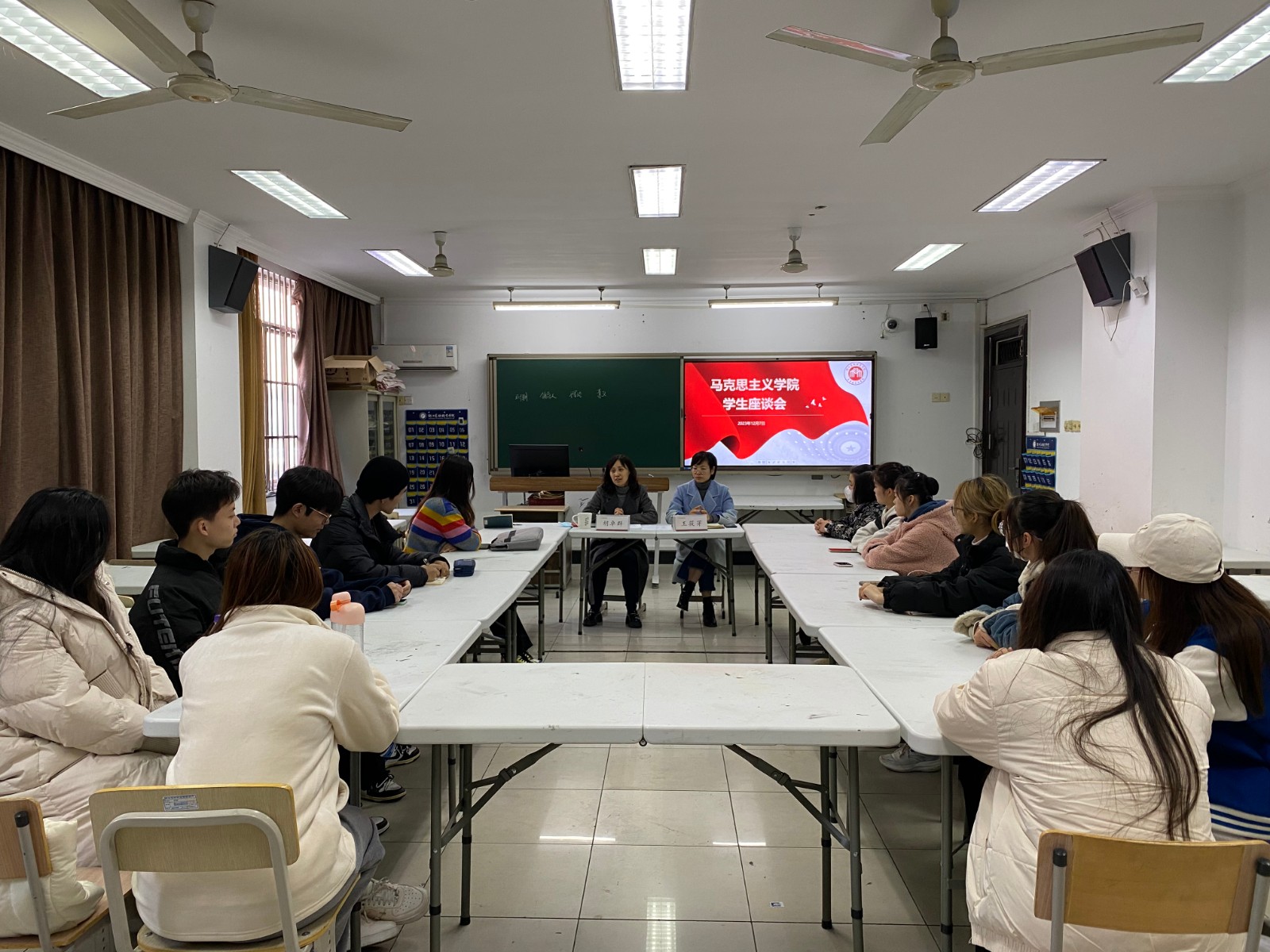 为切实发挥思政课立德树人关键课程作用和马克思主义理论学科引领作用,充分了解思政课教师教学情况,切实提升思政课教学质量,马克思主义学院于11月29日、12月7日分别召开22高职、23高职思政课建设学生座谈会,来自各个学院的29名学生代表和马院班子成员参加了会议。