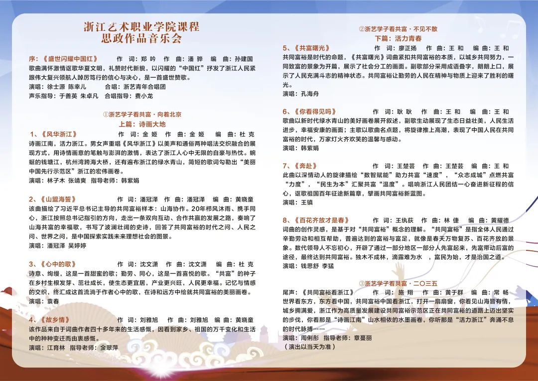 在音乐会的最后,浙艺青年学子周俐彤演唱的《共同富裕看浙江》,讴歌了浙江“诗画江南”山水相依的水墨画卷,展现了“活力浙江”奔涌不息的时代脉搏。