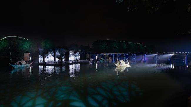 周正平一直对于艺术创作有独特的见解,被中国艺术界誉为“灯光诗人”。本次展览中,周正平的作品有越剧《红玉》和山水剧场《清溪江湖》。《红玉》的灯光设计融入舞美整体空间的韵律,又作为流动的画笔自成体系。在白色调的空灵布景中,使用和谐的色彩和精致的笔触,描绘出简约诗化的情境。在创造意象空间的表现手法上,运用富有张力和节奏感的光影,既刻画了表演动作,又强化了全女班演员在武戏上的阳刚气质。将繁复的技术手段和凝练的艺术构思隐藏在诗意画面背后,通过光形成视觉语汇,与观众进行情绪对话。在《清溪江湖》中,周正平让视觉艺术进入清湖古镇的整体公共空间,既是对沉睡着的江山文化的唤醒,也是他游走半生对故乡的献礼。