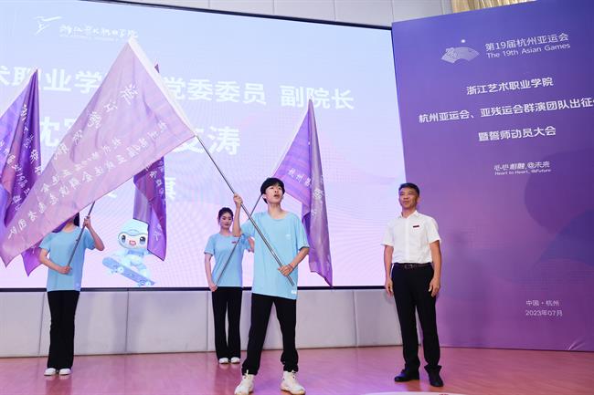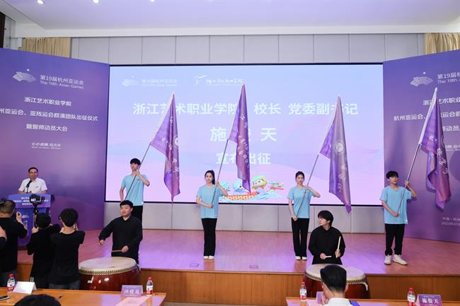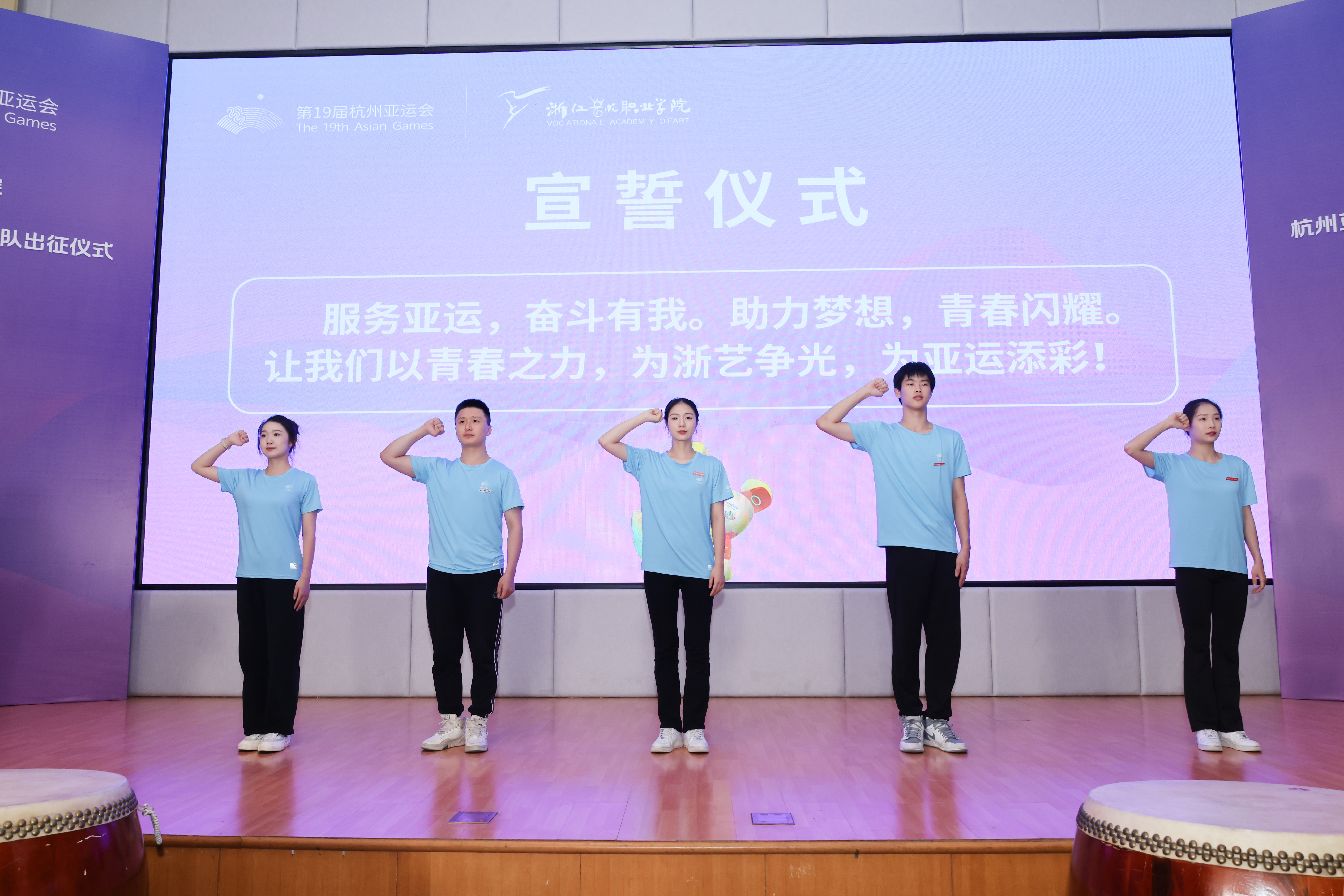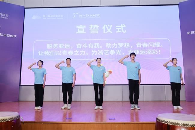 全体亚运会群演誓师宣誓:服务亚运,奋斗有我。助力梦想,青春闪耀。让我们以青春之力,为浙艺争光,为亚运添彩。