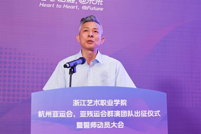 杭州亚运会开幕式总制作人、亚运会闭幕式、亚残运会开闭幕式总导演沙晓岚,杭州亚运会、亚残运会开闭幕式指挥中心仪式演出专班负责人孙俊明,杭州亚运会、亚残运会开闭幕式指挥中心仪式演出专班群演保障组主任沈晓峰,亚运会开幕式制作人、亚运会闭幕式、亚残运会开闭幕式总制作人吴艳,校领导薛亮、施俊天、夏开堂、沈军甫、支涛出席誓师大会。誓师大会由校党委副书记夏开堂主持。