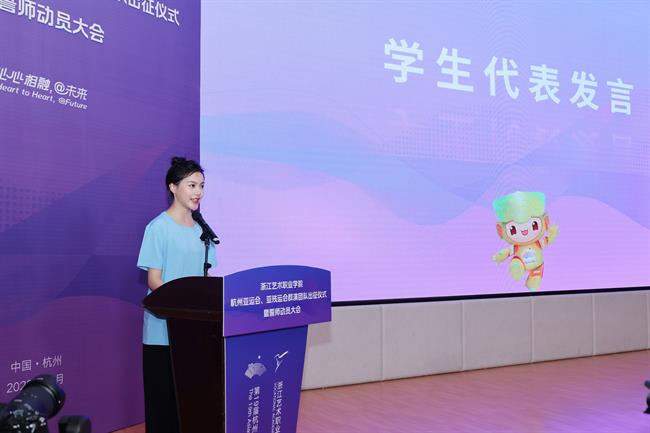 舞蹈学院学生谢梦情作为亚运会群演代表表达了服务亚运,保障亚运是义不容辞的义务,作为新时代中国青年应承担起传播奥林匹克精神使者的神圣职责,将以一流的专业水平,一流的精神状态展现浙艺青年的靓丽风采。